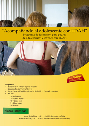 Organizado por la Asociación Riojana de Padres de Niños Hiperactivos, el programa de formación para padres de adolescentes y jóvenes con TDAH, se celebrará en 8 sesiones, sábados, en horario de 11:00 a 13:00 h., en la sede de la asociación ARPANIH, Logroño.