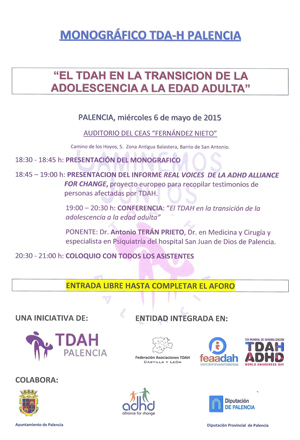 Organizada por la Asociación TDA-H Palencia, en colaboración con ADHD Alliance for Change. Alianza TDAH por el cambio, la Diputación Provincial de Palencia y el Ayuntamiento de Palencia, se celebrará el miércoles, día 6 de mayo de 2015, en el Auditorio del CEAS “Fernández Nieto” del barrio de San Antonio.