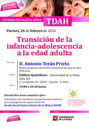 Organizada por la Asociación Riojana de Padres de Niños Hiperactivos, ARPANIH, se celebrará el viernes, día 26 de febrero de 2016, en el aula 101 del Edificio Quintiliano de la Universidad de La Rioja.