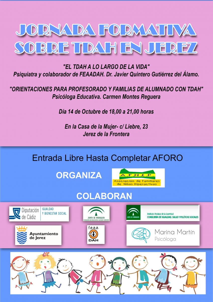 Organizada por la Asociación de familiares de niños hiperactivos, AFHIP, de Jerez de la Frontera, se celebrará el hoy viernes, día 14 de octubre de 2016, en la Casa de la Mujer.