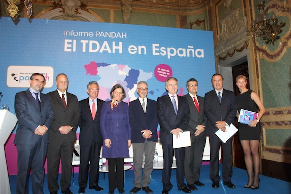 De izquierda a derecha, los intervinientes en el acto: los doctores Javier Quintero, Jefe de Servicio de Psiquiatría en el Hospital Infanta Leonor de Madrid, Miguel Casas, Jefe de Servicio de Psiquiatría en el Hospital Valle de Hebrón y Luis Rojas Marcos; Sonia García, subdirectora de Calidad del Ministerio de Sanidad; Fulgencio Madrid, presidente de FEAADAH; Francisco López, presidente del Consejo Escolar de Estado; el doctor César Soutullo, Jefe de Psiquiatría Infantil en la Clínica Universidad de Navarra; Javier Urcelay, vicepresidente europeo de Shire y Anne Igartiburu, presentadora del acto.