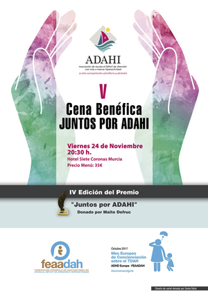 Organizada por ADAHI, Asociación de Ayuda al Déficit de Atención con más o menos Hiperactividad de Murcia, se celebrará el viernes, día 24 de noviembre de 2017, a las 20:30 horas en el Hotel Occidental Siete Coronas Murcia.