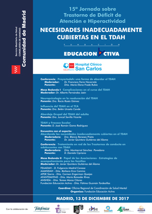 Organizada por la Fundación Educación Activa, coordinada por la Oficina Regional de Coordinación de Salud Mental de la Comunidad de Madrid, se celebrará el miércoles, día 13 de diciembre de 2017, en el Hospital Clínico San Carlos, Pabellón de Docencia Profesor Martín Lago.